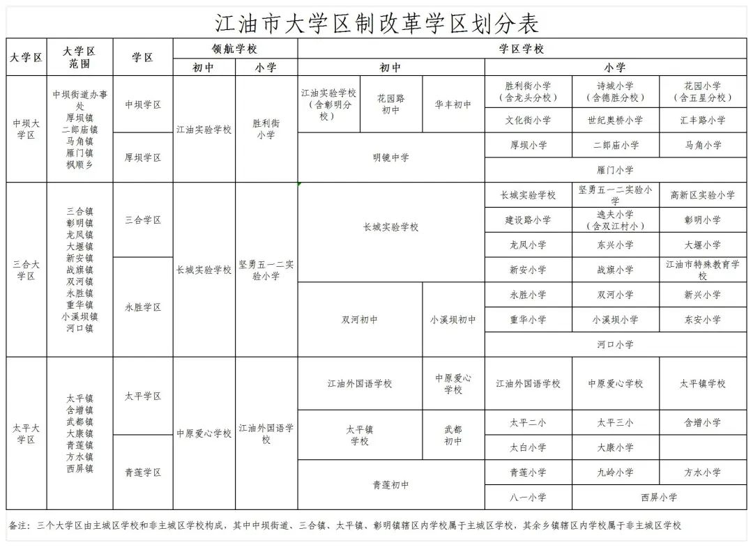 (三)太平大学区。太平大学区范围内符合条件的小学毕业生可以申报中原爱心学校(初中部)公布的共享学位。(江油市大学区制改革学区划分表见附件)。