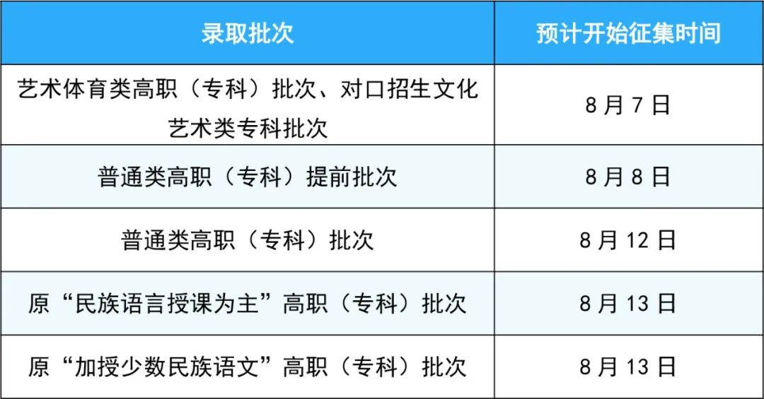 8月,高考录取进入普通类、艺术类、体育类等多个招生类型的高职(专科)批次,各批次预计录取时间详见下表。