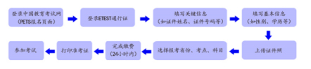 PETS统一采用网上报名系统进行报名。考生须登录教育部教育考试院PETS报名网站(http://pets.neea.edu.cn/),参照以下操作流程进行报名: