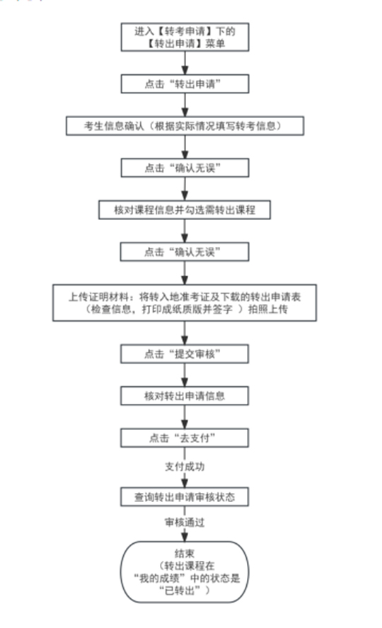 考生提交转出申请并交费确认后,考生的转考电子档案将统一通过国家转考平台转出,转出目的省市是否接收及审核结果一般可于申请当月月底公布。考生可通过“自考考生服务平台”—“转考申请”—“转出申请”查询结果。