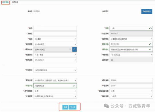 考生完成信息填报和资料上传后,由各地(市)教育考试机构,格办政工人事处,西藏民族大学招生就业处进行网上审核。审核通过后,考生本人须在网上完成信息最终确认;未经审核部门和考生本人双方共同审核确认的报名信息无效。因委托他人(包括单位)或考生本人出现失误(含未按要求规范填报或上传资料等),责任由考生本人承担。