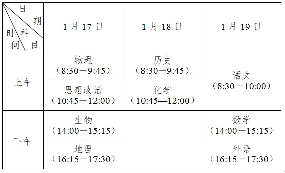 考试时间为2026年1月17日-19日。除语文科目考试时长为90分钟外,其他各科均为75分钟。具体安排如下:![]()