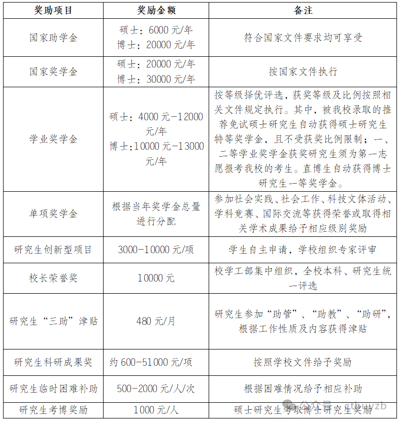 注:表中各类奖助学金仅面向全日制、非定向就业硕士研究生评选,评选细则以学校相关文件及通知为准。