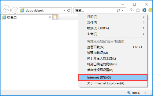 打开IE浏览器,点击“设置”- “Internet(选项)”,如下图:![]()