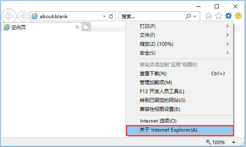 1.打开IE浏览器,点击“设置”- “关于Internet Explorer(A)”按钮,如下图:![]()