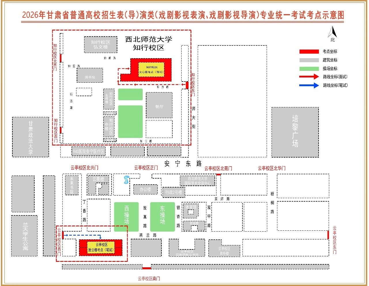 甘肃2026年表(导)演类(戏剧影视表演、戏剧影视导演)专业考试考点设在西北师范大学云亭校区,面试考点设在西北师范大学知行校区。